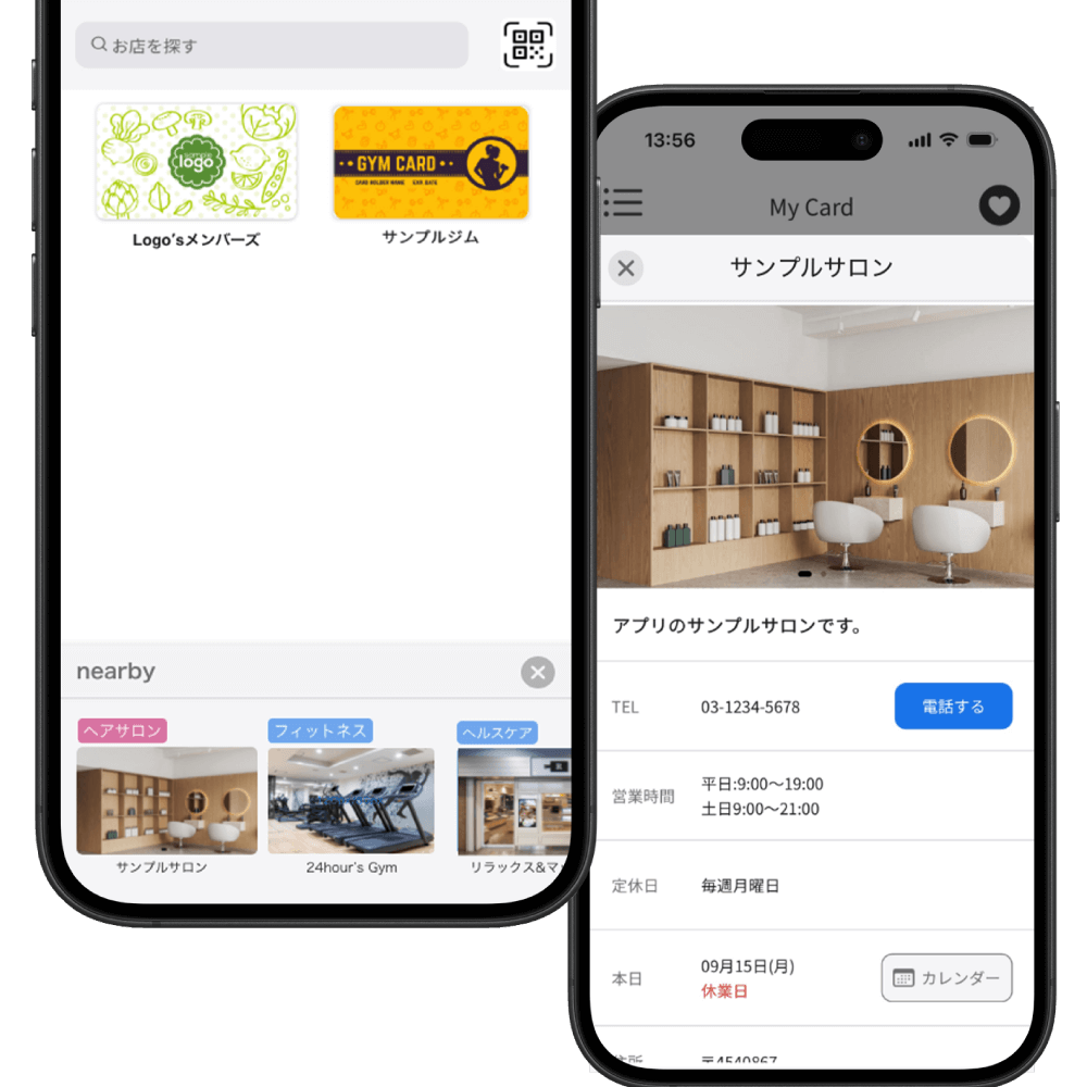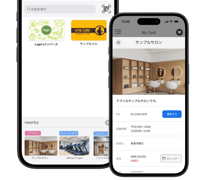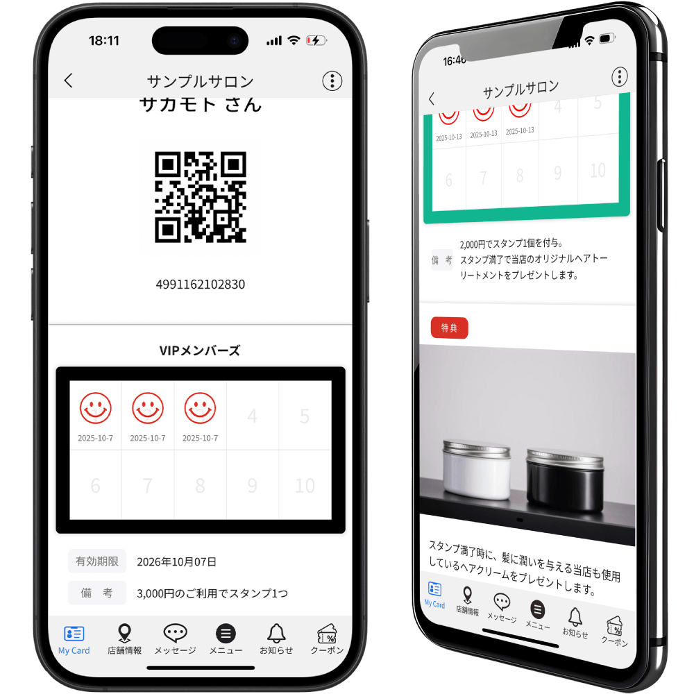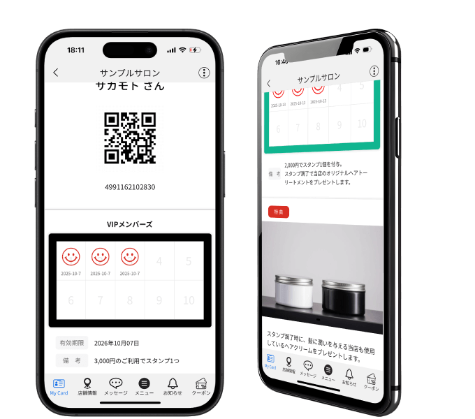 QRコード付きのデジタル会員証。ポイント付与や有効期限、特典案内、次回予約日時の表示、複数カード登録など便利な機能を備えています。