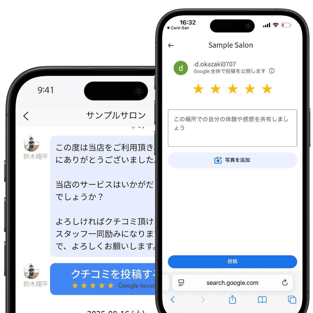 Googleマイビジネスのクチコミ連携機能を活用して、簡単に口コミを集め、google検索結果に強くなります。また、アプリ内で直接クチコミを依頼できる機能や、SNS(インスタグラム)との連携により、情報発信の手間を減らし、効果的な集客が可能です。