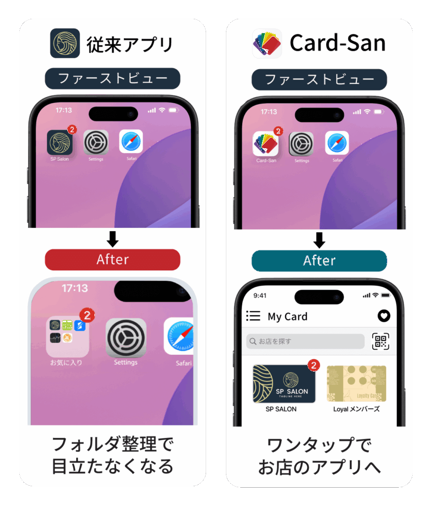 「店舗アプリ+ポータル型」の仕組みのため、スマホのファーストビューは Card-San のアプリになります。そのため「最初から自分のお店のアプリを見せたい」という方には、やや不向きに感じられる場合があります。