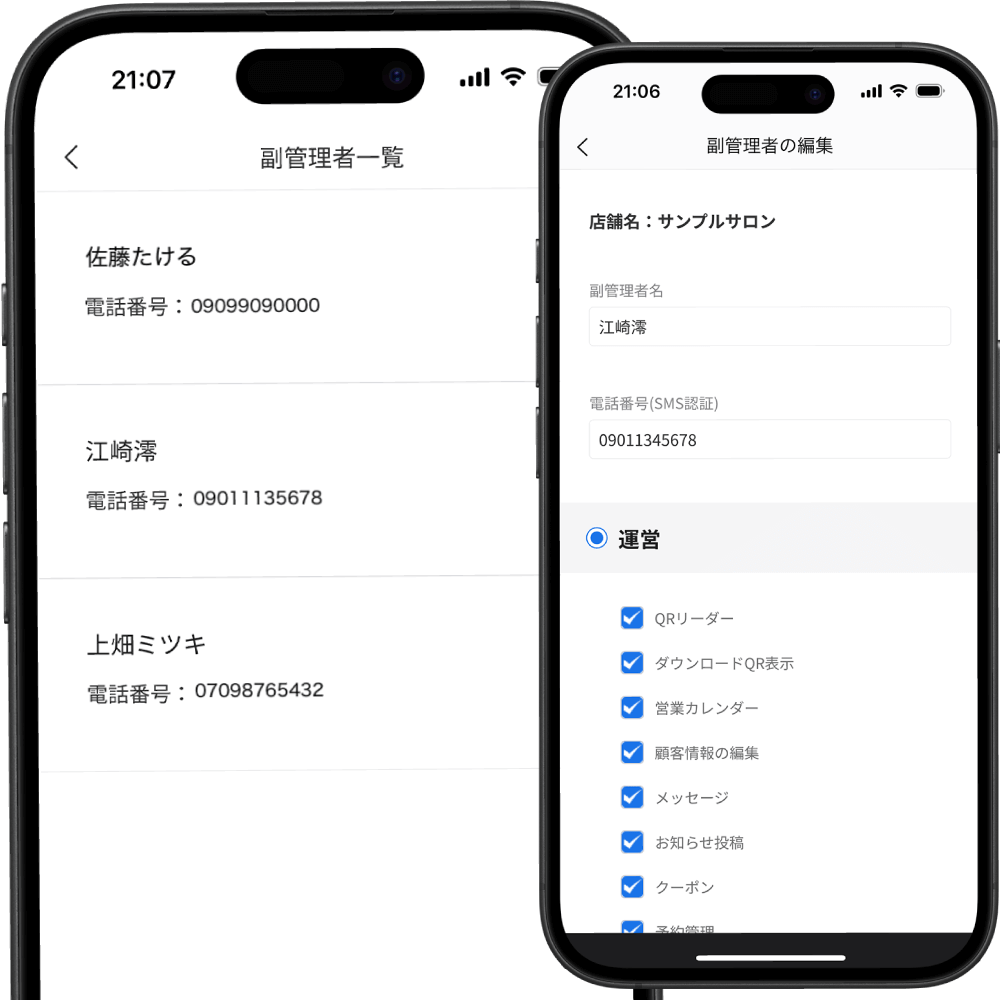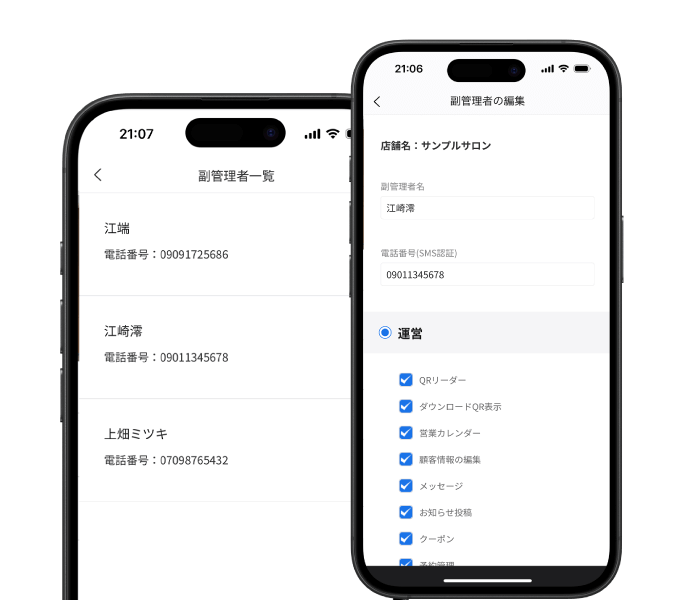 副管理者を登録すると、複数人で同時にアプリの設定や運用が可能に。担当者ごとに機能制限を設定でき、役割に合わせた業務分担が行えます。