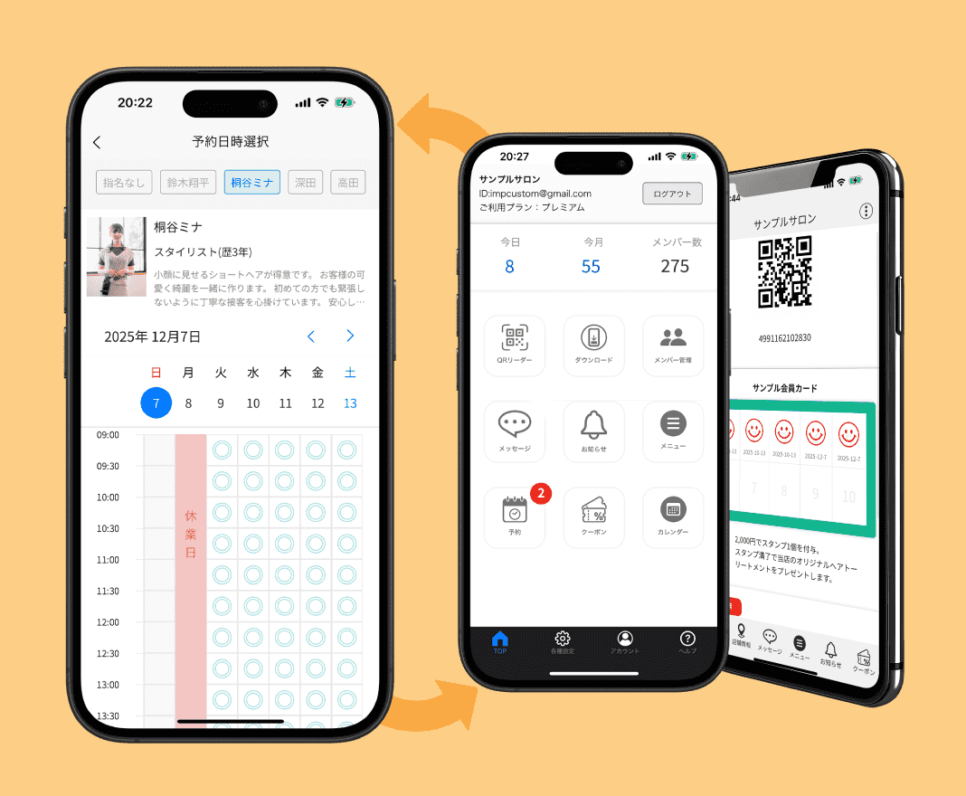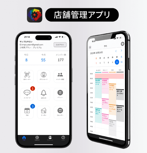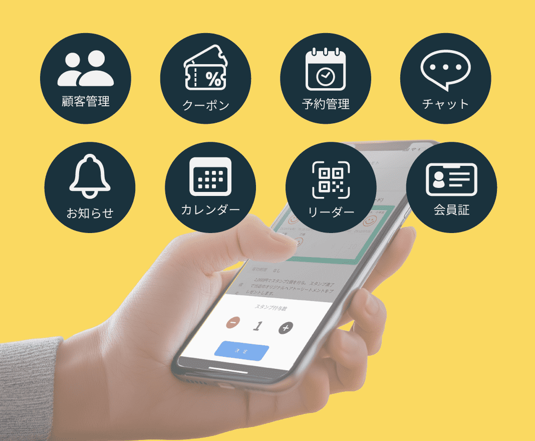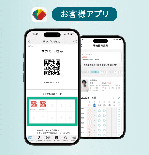 ヘアサロン、ネイルサロン、マツエク、フィットネスジム、リラク、整体院など、1対1でサービス提供するビジネスに向いています。 また会員証やスタンプカードを発行して顧客を囲い込みするようなビジネスに向いてます。飲食店では使えないのか?というご質問もよく頂きます。飲食店でもご利用できます。ただ予約機能が飲食店向けではありません。 会員管理やマーケティングツールとしてなら、サロン以外でも十分利用できます。サロン以外には飲食店、クリーニング店、入浴施設、日焼けサロンで利用されています。