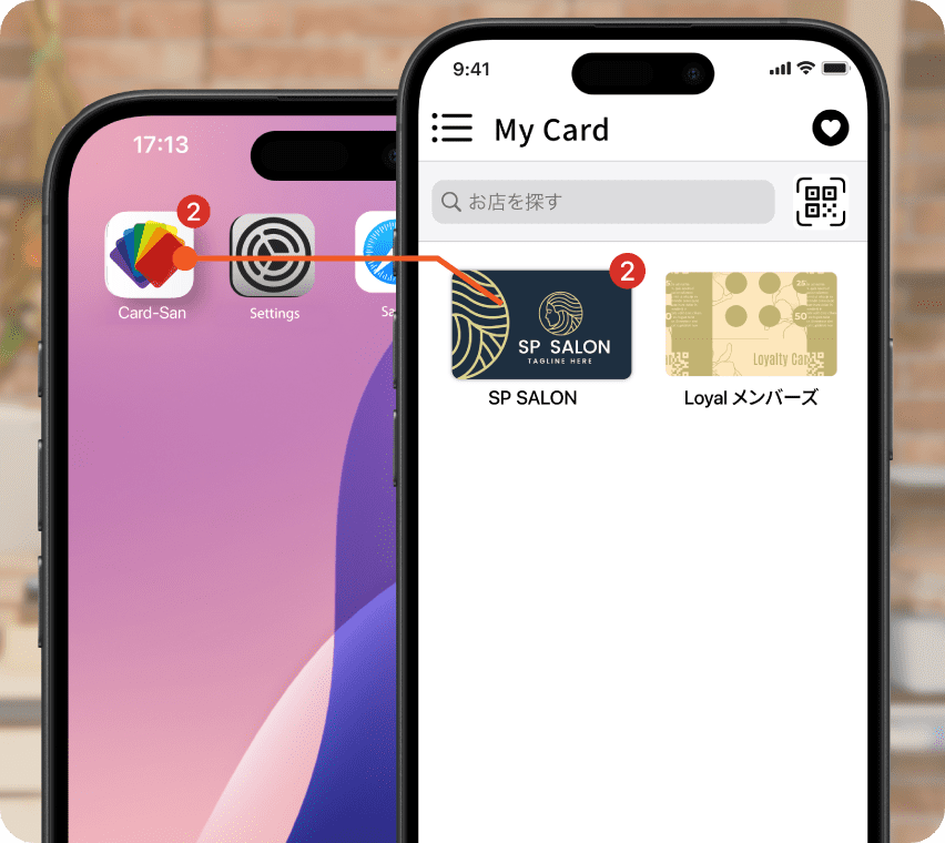 Card-Sanアプリが表示され、そこからワンタップで店舗アプリへ進む流れです。